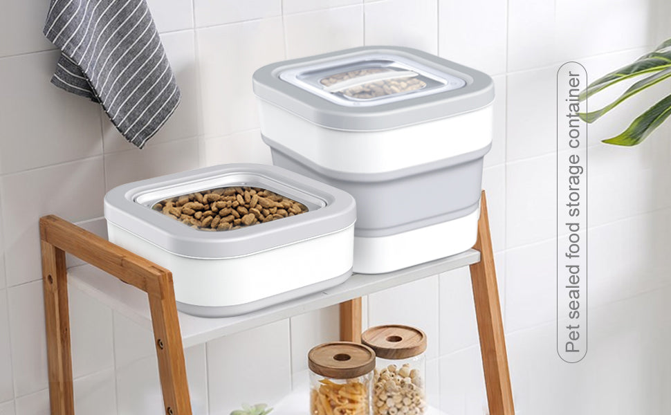 The large dog food container is designed to be collapsible to achieve two capacity modes,you can choose to fold it or not based on your daily storage and save space when appropriate